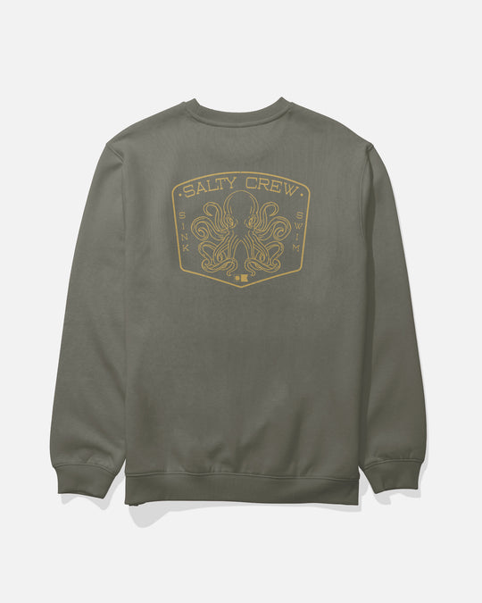The Tako Club Crew Neck Fleece in Dusty Olive features bold graphic detailing inspired by life on the water and the pursuit of the next catch.